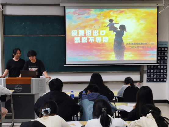 “同學(xué)們,猜一猜明天是什么節(jié)日啊?”“母親節(jié)!”5月11日,新聞傳播學(xué)類(lèi)專(zhuān)業(yè)2023(7)、(8)班在K202教室開(kāi)展以“愛(ài)要說(shuō)出口,感恩不等待”為主題的團(tuán)建活動(dòng)。活動(dòng)開(kāi)始前,活動(dòng)負(fù)責(zé)人、新聞傳播學(xué)類(lèi)專(zhuān)業(yè)2023(7)、(8)班的班長(zhǎng)楊雨霏、朱研溪提前為每位同學(xué)準(zhǔn)備好信紙和信封。朱研溪說(shuō):“我們希望通過(guò)寫(xiě)信這種傳統(tǒng)而深情的溝通方式,讓同學(xué)們勇敢表達(dá)自己的心聲,將對(duì)母親的愛(ài)訴說(shuō)于筆尖。”學(xué)生們觀(guān)看一段關(guān)于母愛(ài)的感人短片后,...